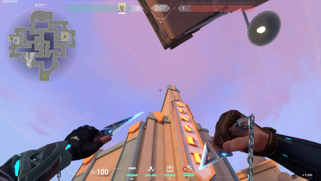 2つの花瓶に張り付いて看板の角とULTマークの左角を合わせて0バウンス2チャージ